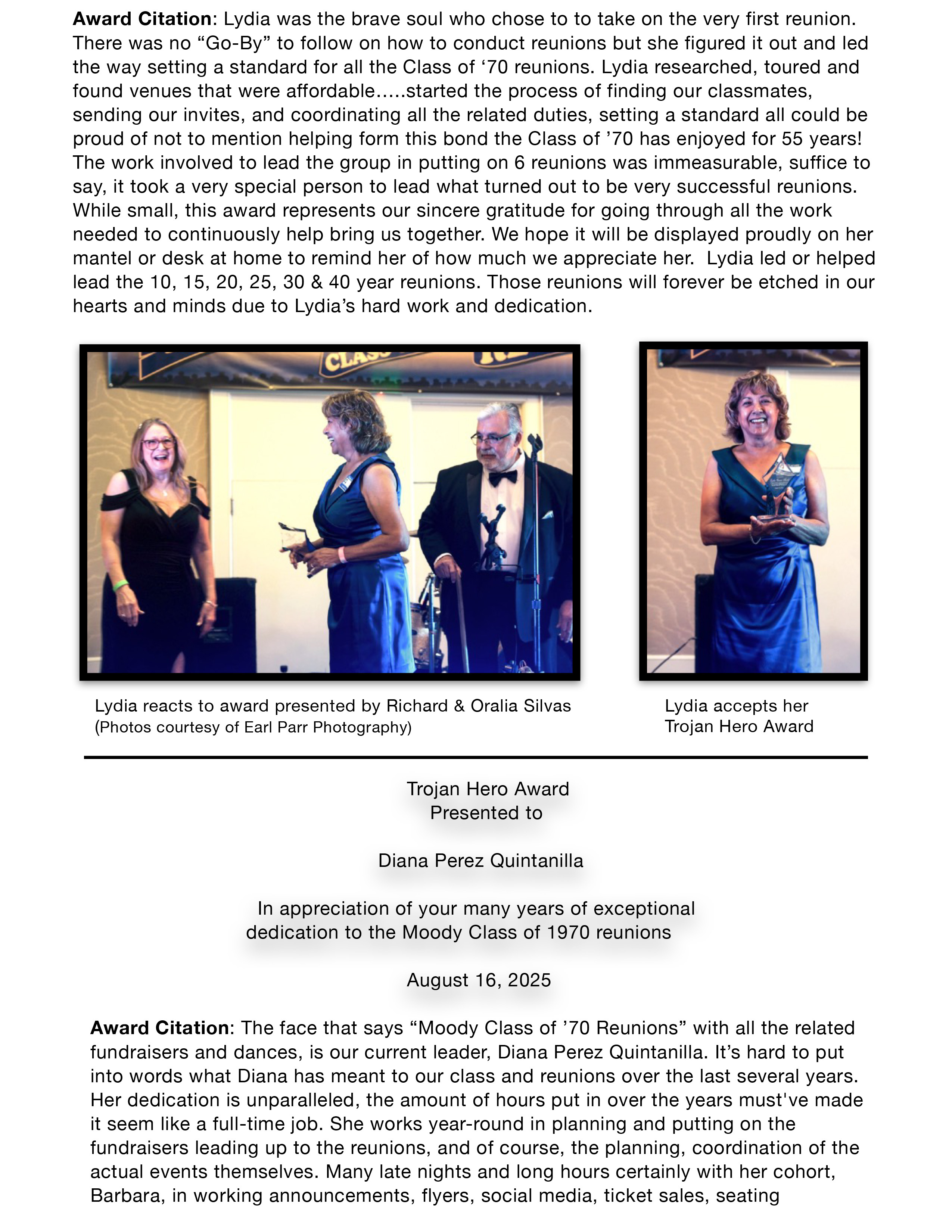 There are some follow-up things to do now, most notably the building of our memory book. To that end, I’d like to ask that you send me photos you may have taken at our reunion. Please include names and the year they graduated if possible. Second, I’d like to ask if you would be so kind as to provide all of your contact info so we can more easily contact you for any future events. Please provide me with your phone numbers so that I can send texts and an email so that we can provide things such as flyers. Lastly, I’d like to ask if you know of anyone from the Class of ’70 that did not attend this or any of the other reunions, if so, please provide their names and contact information in the event we hold another event.